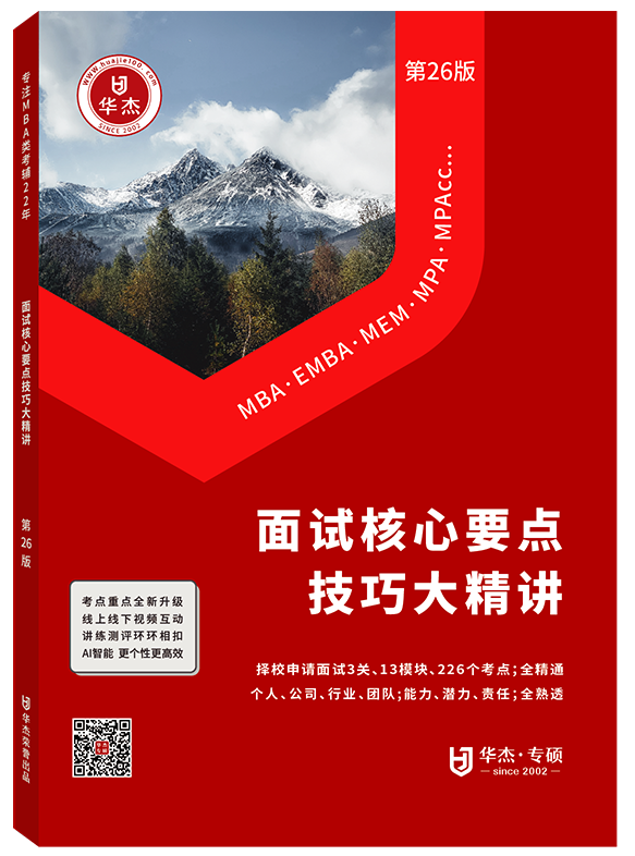本系列MBA名校提面教材为华杰名师团独立编写,私有版权;版权所有,抄袭必究。除了本系列教材外,还有大量的补充材料,我们也会同时发给大家。另外,请随时关注华杰官网的“面试"专栏,里面有各类真题、提面常识及院校提面秘笈!