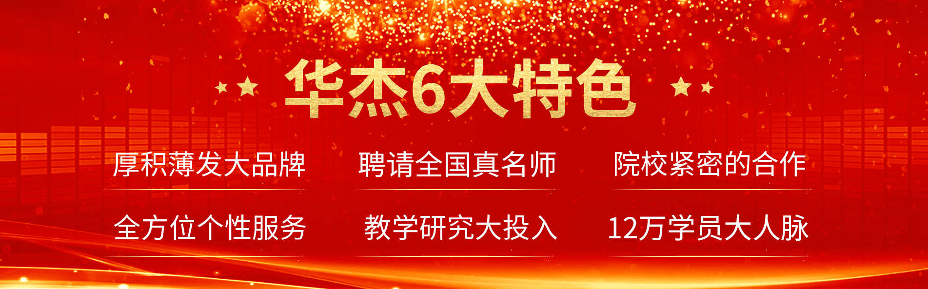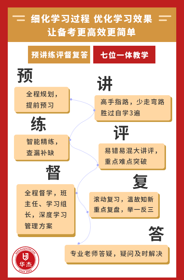 22年来,华杰只相信品质、教研、服务三位一体方能真的做到为学员用心服务;本着一切为了学员、为了学员一切的方针,华杰一直坚持只请全国真正的名师、每时每刻想着如何帮助学员提高学习效率与成绩、不断提高服务层次与水平。华杰坚信,只有口碑才是好的宣传,所以华杰学员的85%以上都来自老学员介绍。